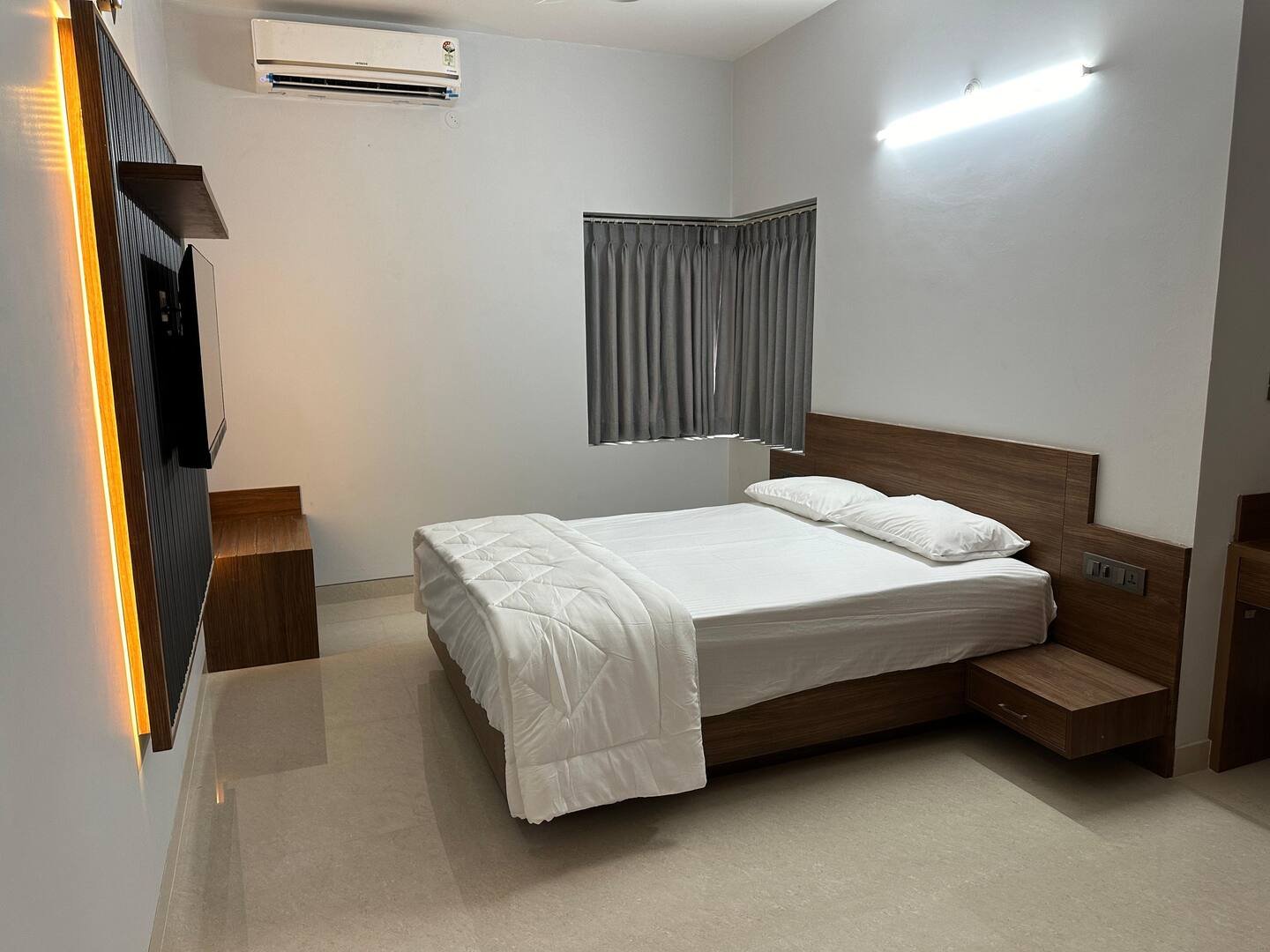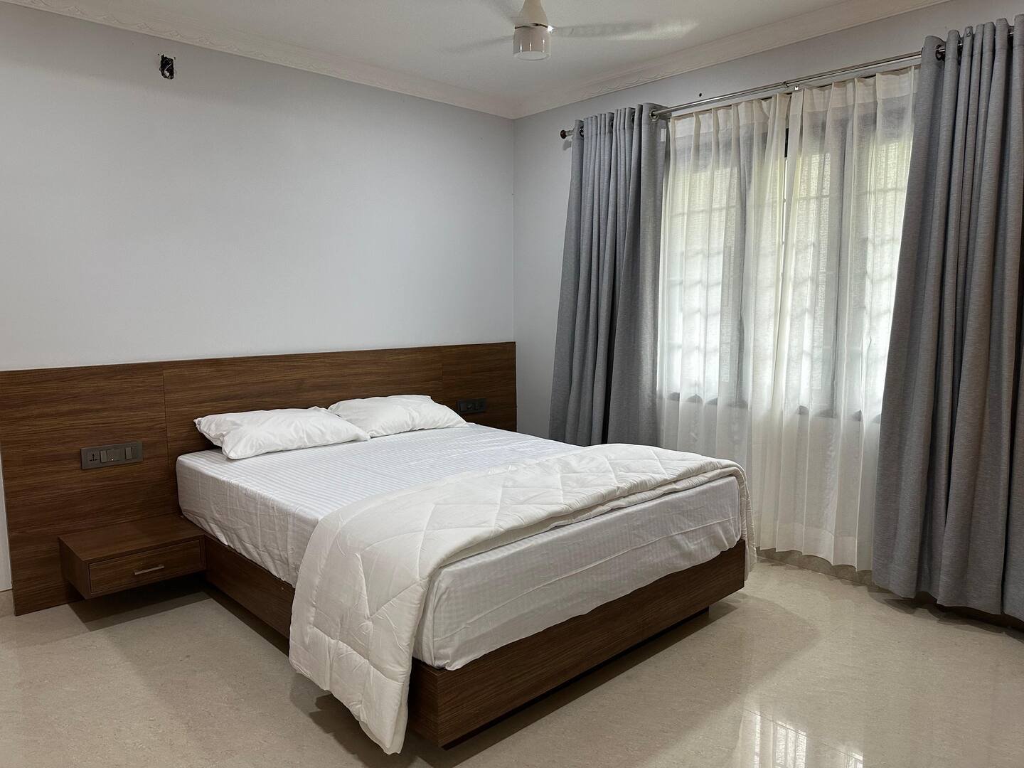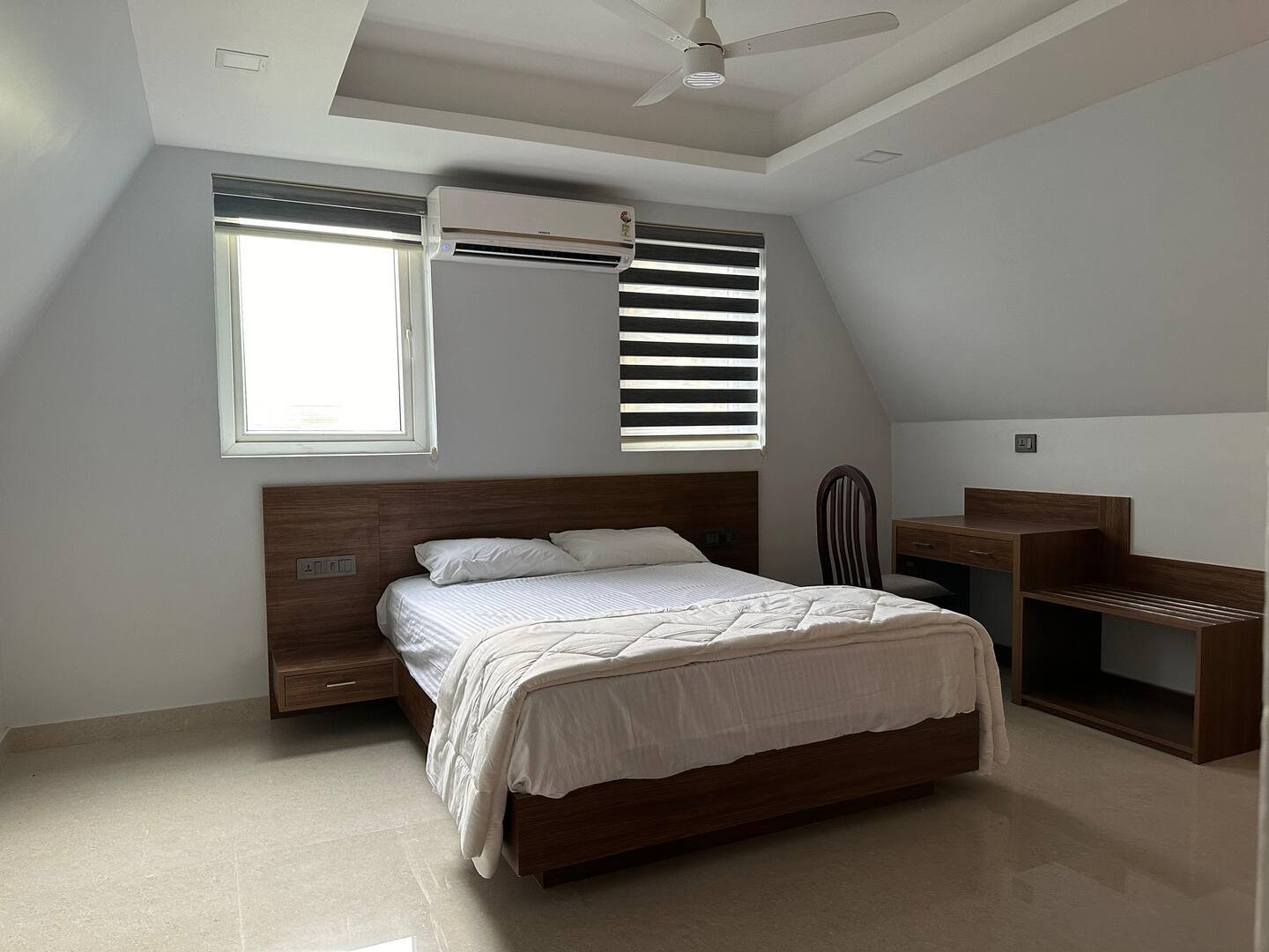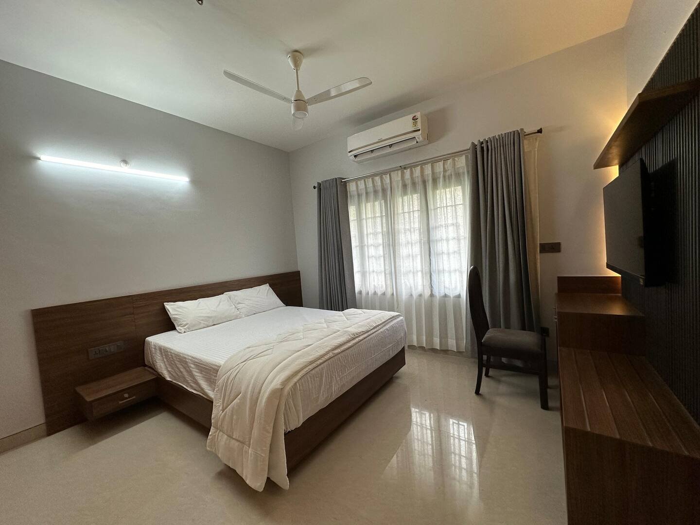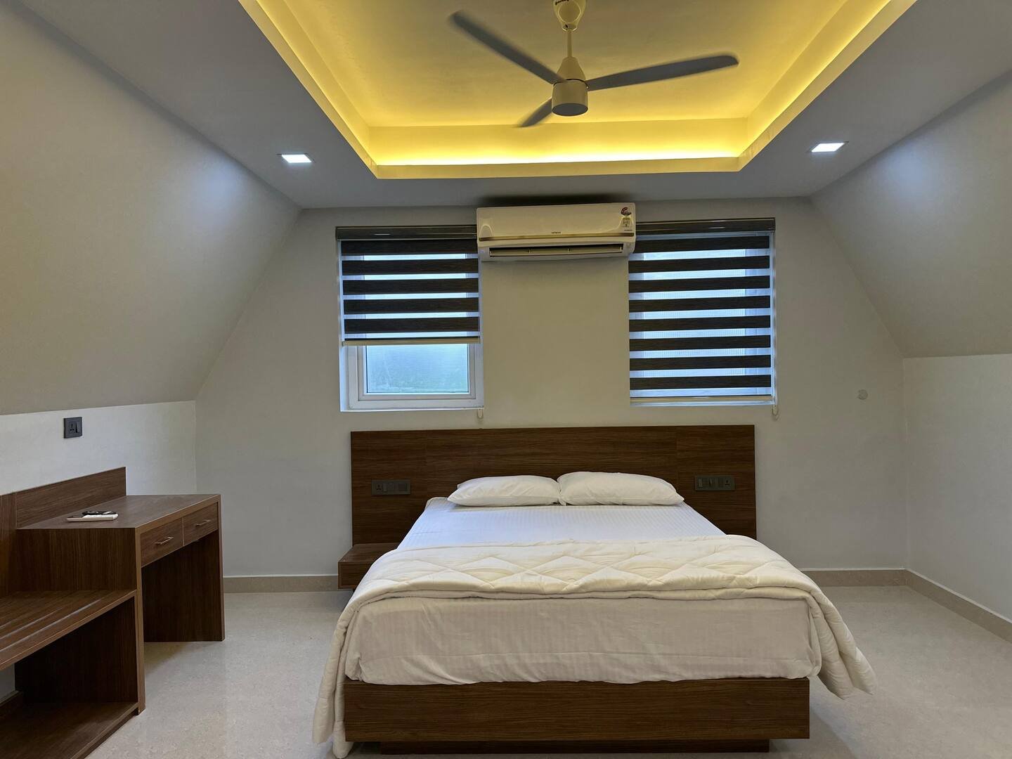 Tucked away in Edappally, this charming villa pairs elegant sloping grey roofs with crisp white accents, creating a serene and stylish retreat. Guests are welcomed by a lush garden, a sunny terrace, and a fully equipped fitness centre.